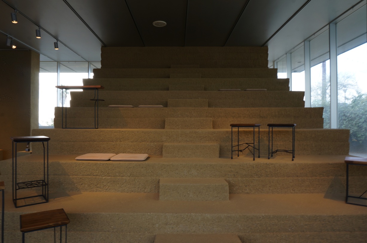 こちらも、先述の設計事務所が設計されました。日本の伝統文化である“土壁”を製造する近畿壁材工業さんが“土”の魅力を発信するためにつくられた施設です。壁と床、柱、扉、洗面台等が様々な工法も用いた土で仕上げられています。床は隆起していたり、1トン以上の土を使った版築塀であったり、土で作られた階段に昇ったり…。五感で楽しむ施設でした。館内では施設の方が細かく説明をして下さり、貴重な経験をさせていただきました。